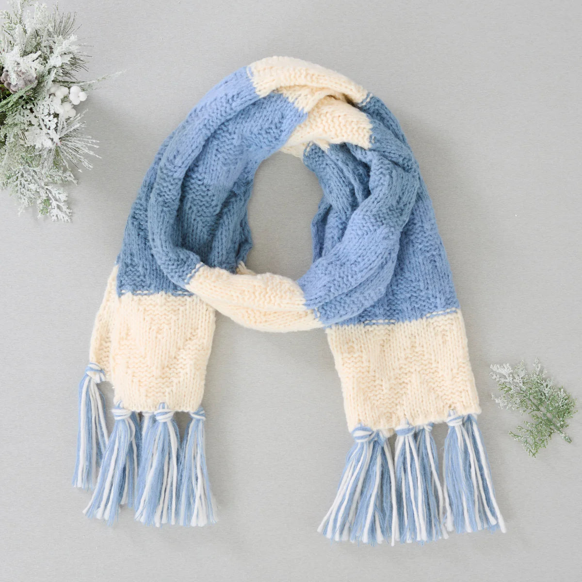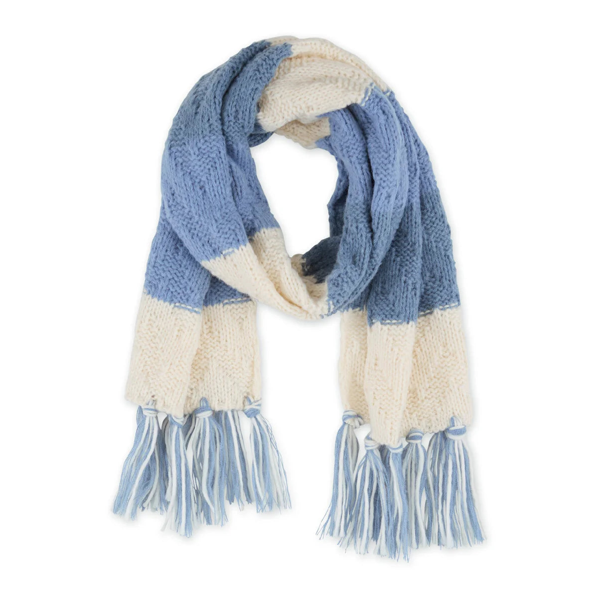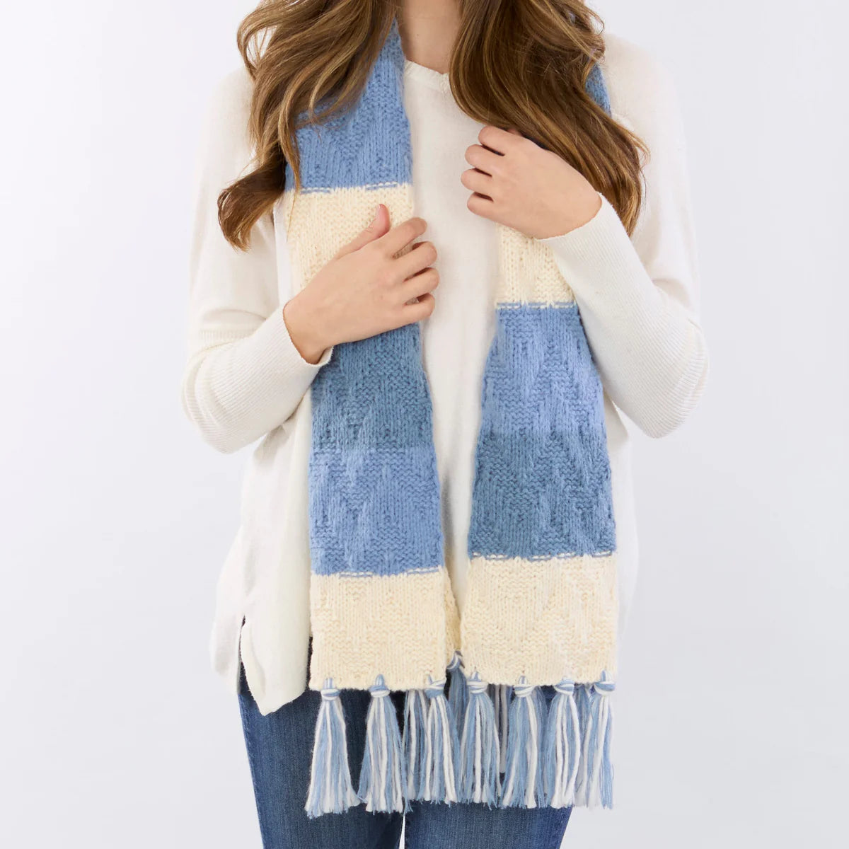 mid-weight layering piece designed for comfort and versatility, this Scarf features defined color-blocked stripes and a subtle chevron knit for added texture. The elongated, narrow silhouette allows for easy wrapping and layering without excess bulk. Finished with 5-inch hand-knotted tassels for a polished, playful edge.