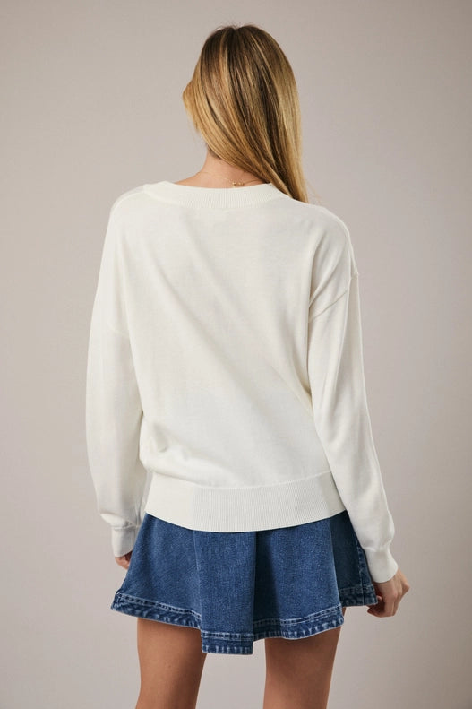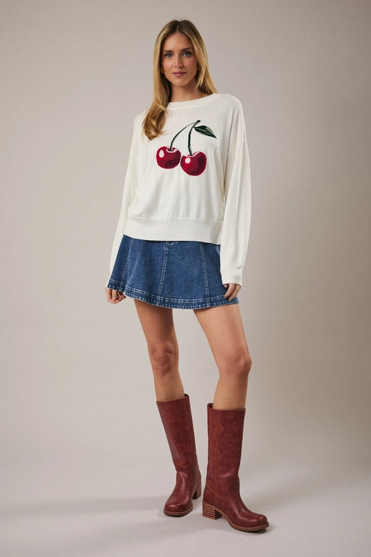 Sweet and effortlessly wearable, the Cherry Graphic Lightweight Sweater adds a playful pop to your everyday knitwear. Designed with a classic round neckline and long sleeves, this lightweight sweater features a bold cherry graphic that brings charm and personality to a timeless silhouette. Perfect for layering or wearing on its own through transitional seasons.