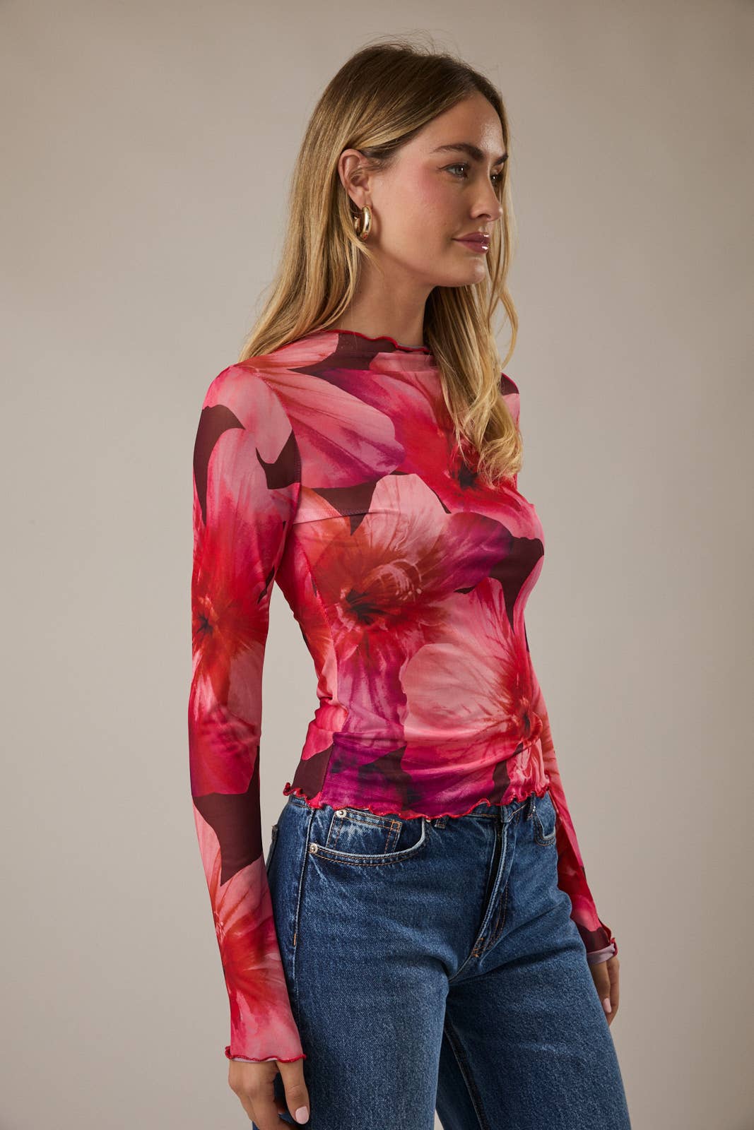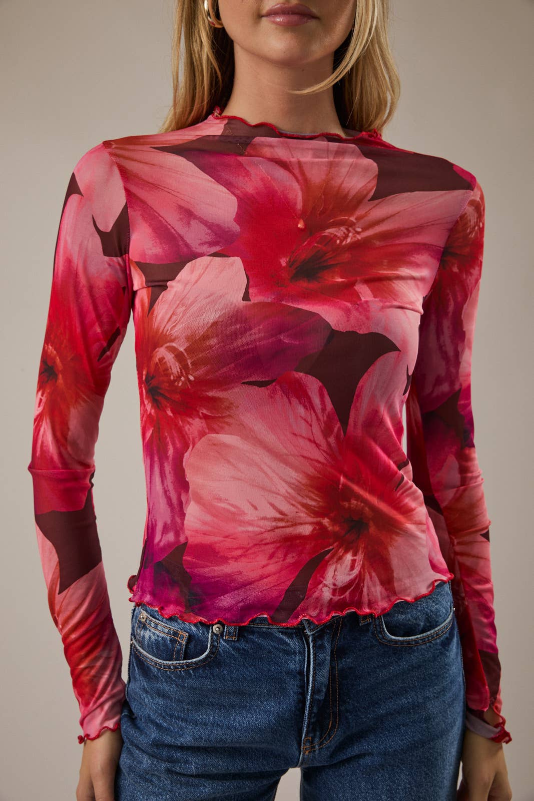 Delicate, lightweight, and perfect for layering, this Floral Mesh Long Sleeve Top adds effortless texture and femininity to any outfit. Designed with a semi-sheer mesh fabric and finished with soft merrow hems, it’s ideal worn under knits, dresses, or styled on its own for an elevated everyday look.