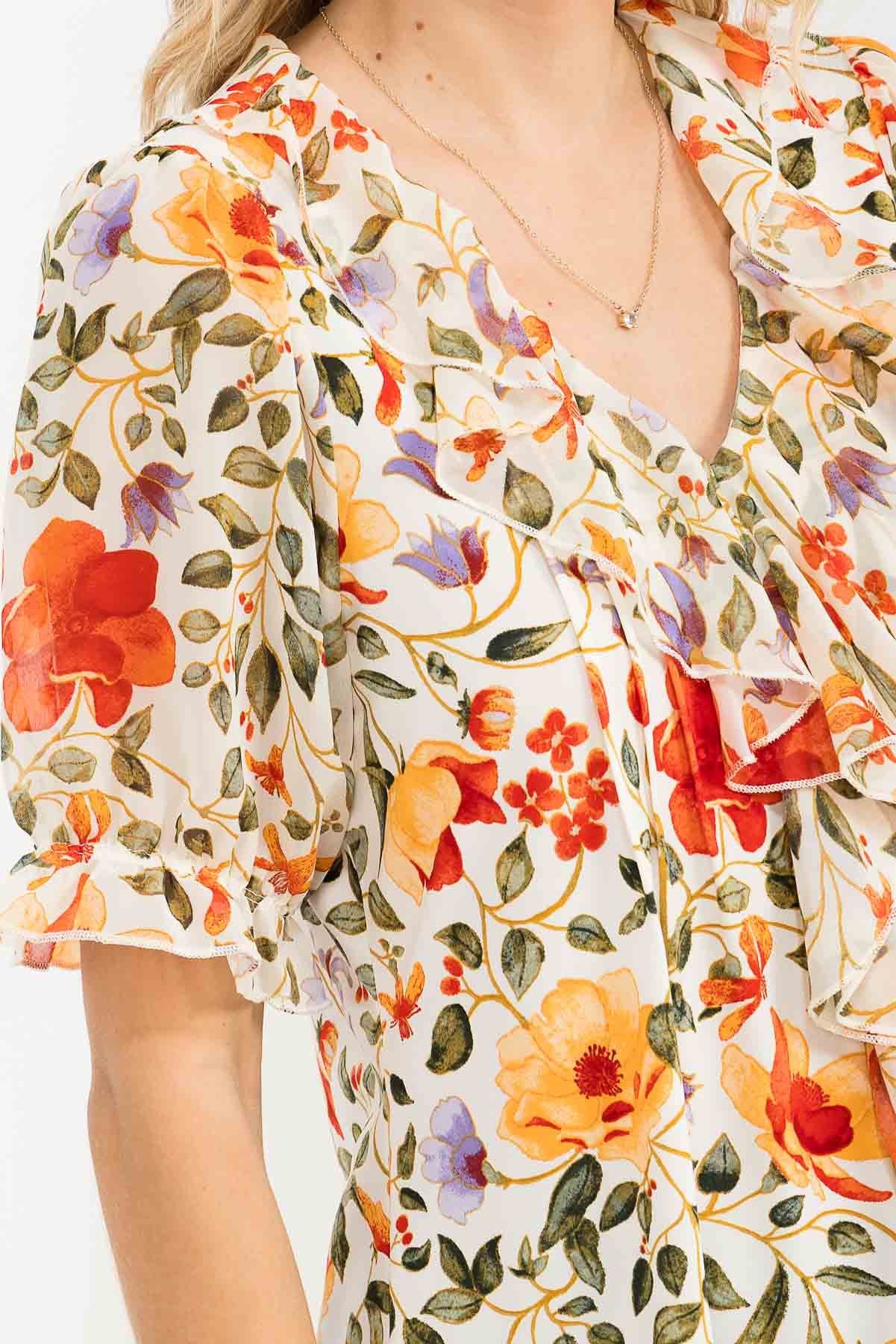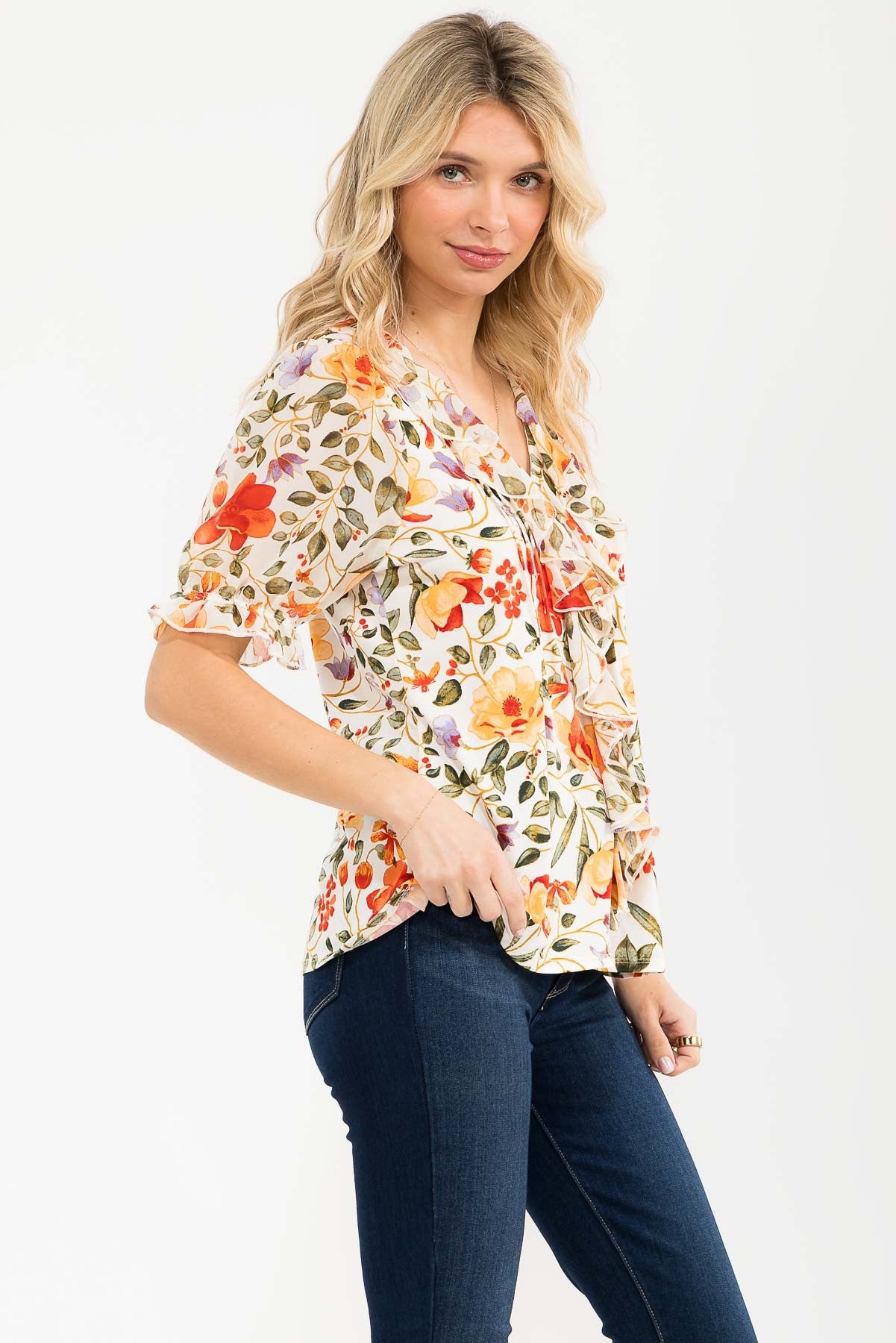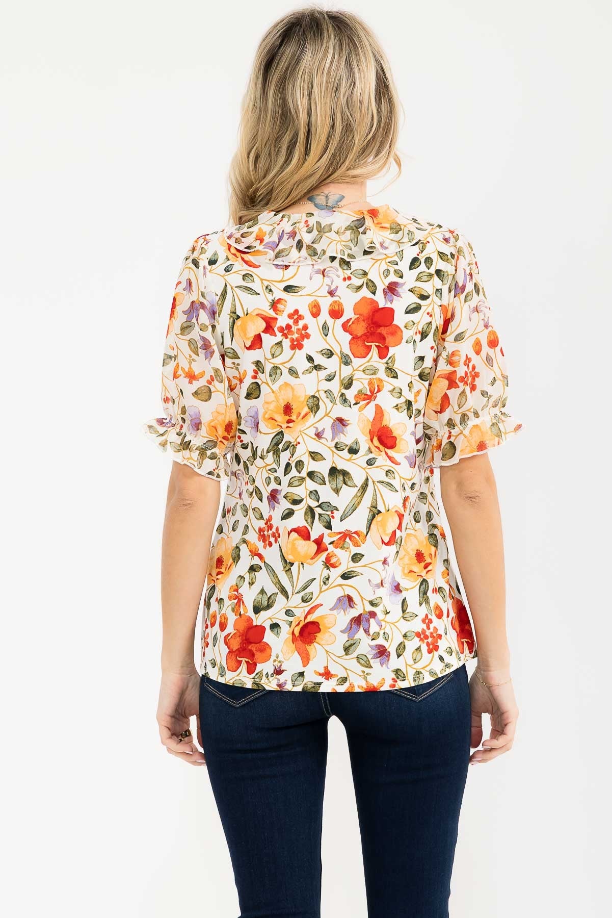 Romantic and refined, this Floral Mixed Media Pintuck Cascade Blouse features soft cascading ruffles and delicate pintuck detailing for an elevated, feminine look. Designed with a flattering V neckline and airy sheer sleeves, it blends vintage-inspired charm with modern wearability. Puff sleeves add gentle volume, making this blouse perfect for pairing with denim, trousers, or skirts for an effortlessly polished outfit.