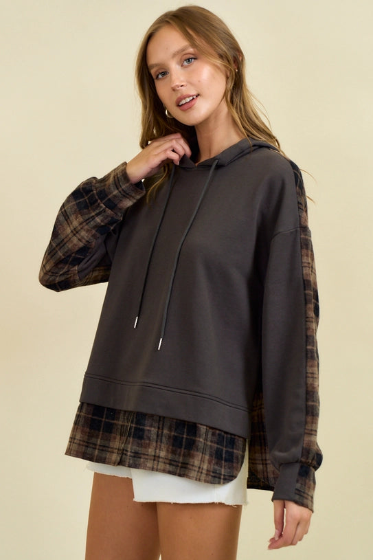 FRENCH TERRY & FLANNEL MIXED PULLOWOVER HOODIE