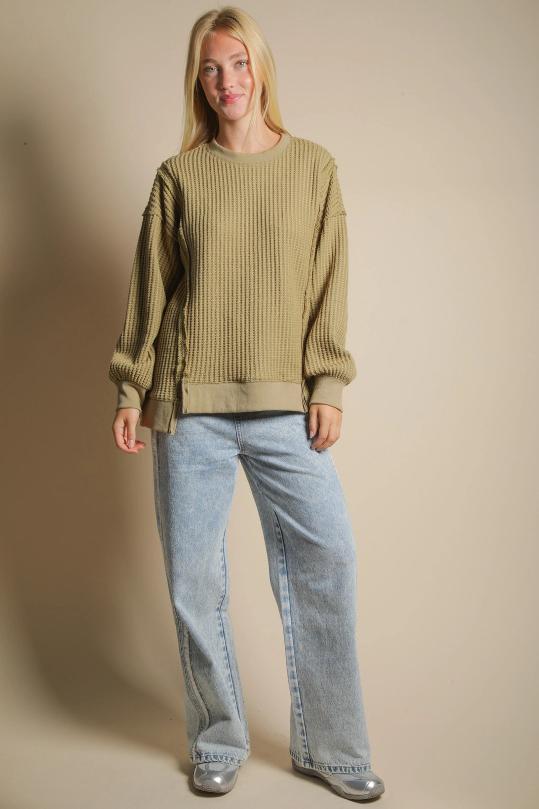 Laid-back, textured, and effortlessly cool — the Oversized Waffle Knit Raw Edge Top is that throw-on-and-go piece you’ll live in all season. Designed with a relaxed silhouette and soft waffle knit texture, this top features drop shoulders, raw edge detailing, and a subtle front slit for that perfectly undone finish.