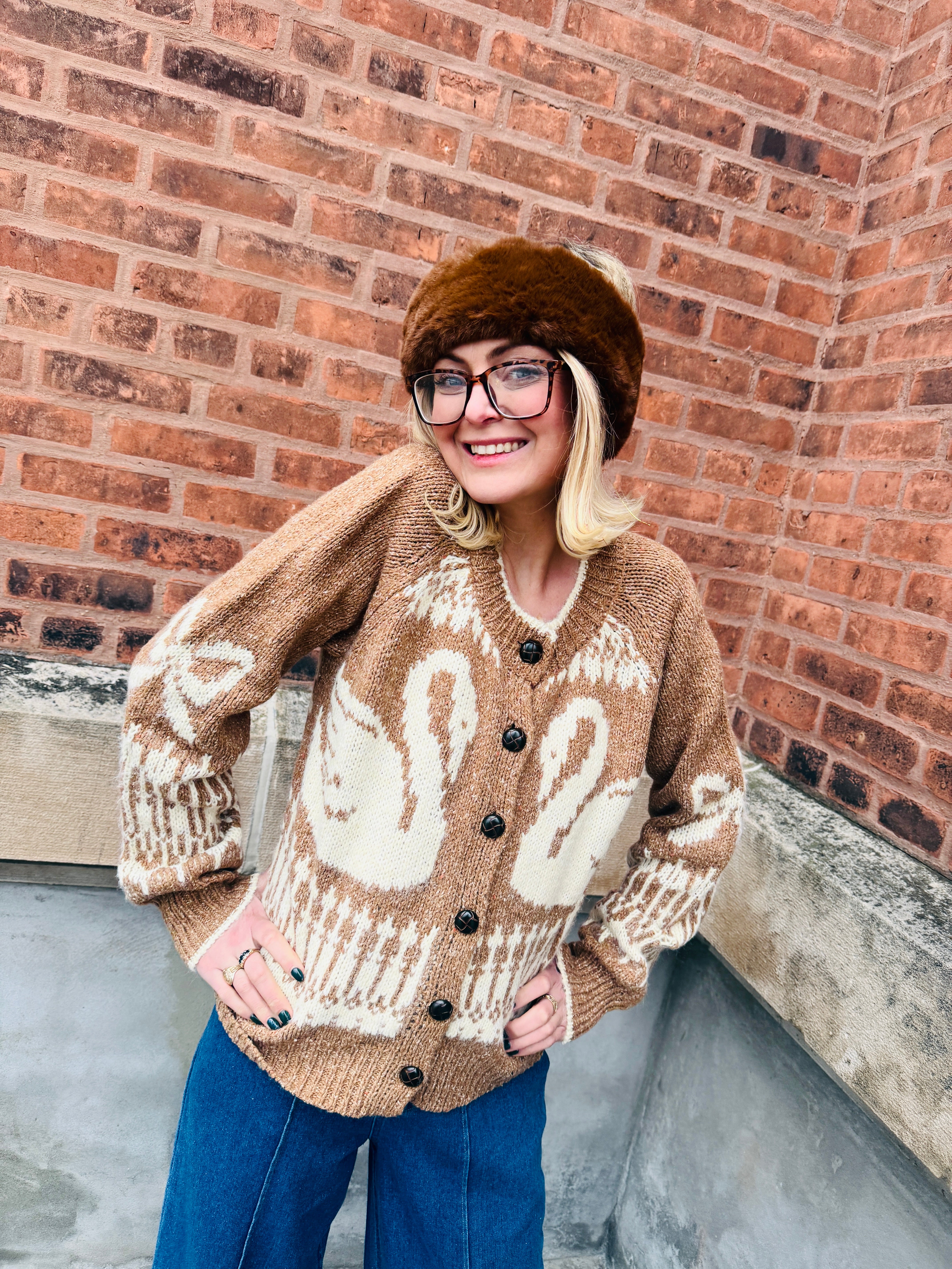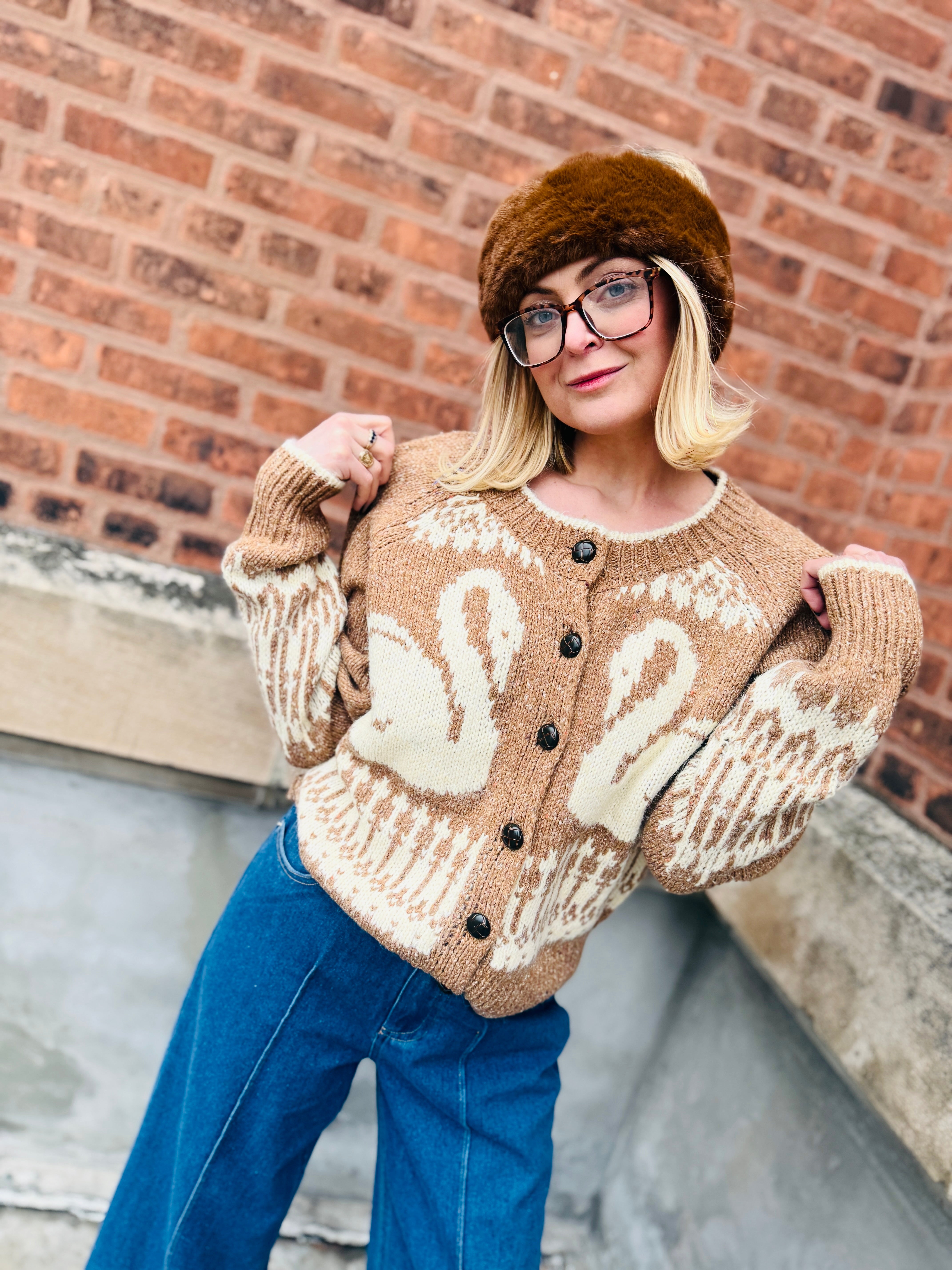 A cozy classic with a whimsical twist, the Blu Pepper Fair Isle Swan Cardigan brings charm and warmth together in one standout knit. Featuring elegant swan motifs woven into a rich caramel jacquard knit, this cardigan feels like fall wrapped in softness—perfect for layering through the cooler seasons.