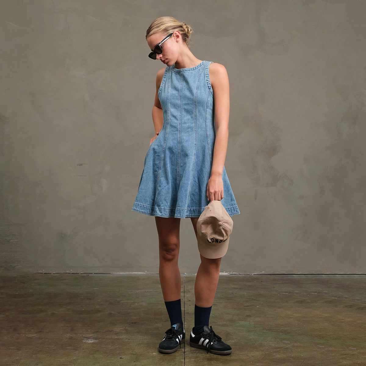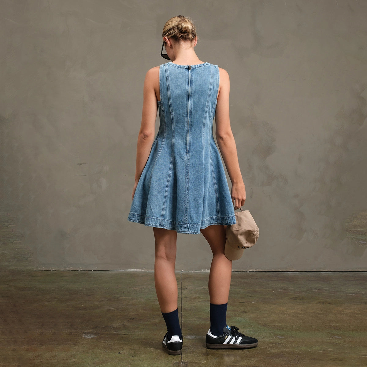 Classic yet playful, the Denim Circle Dress is designed with a flattering fit-and-flare silhouette that moves effortlessly with you. Featuring a back zipper closure and functional side pockets, this piece blends practicality with timeless style.