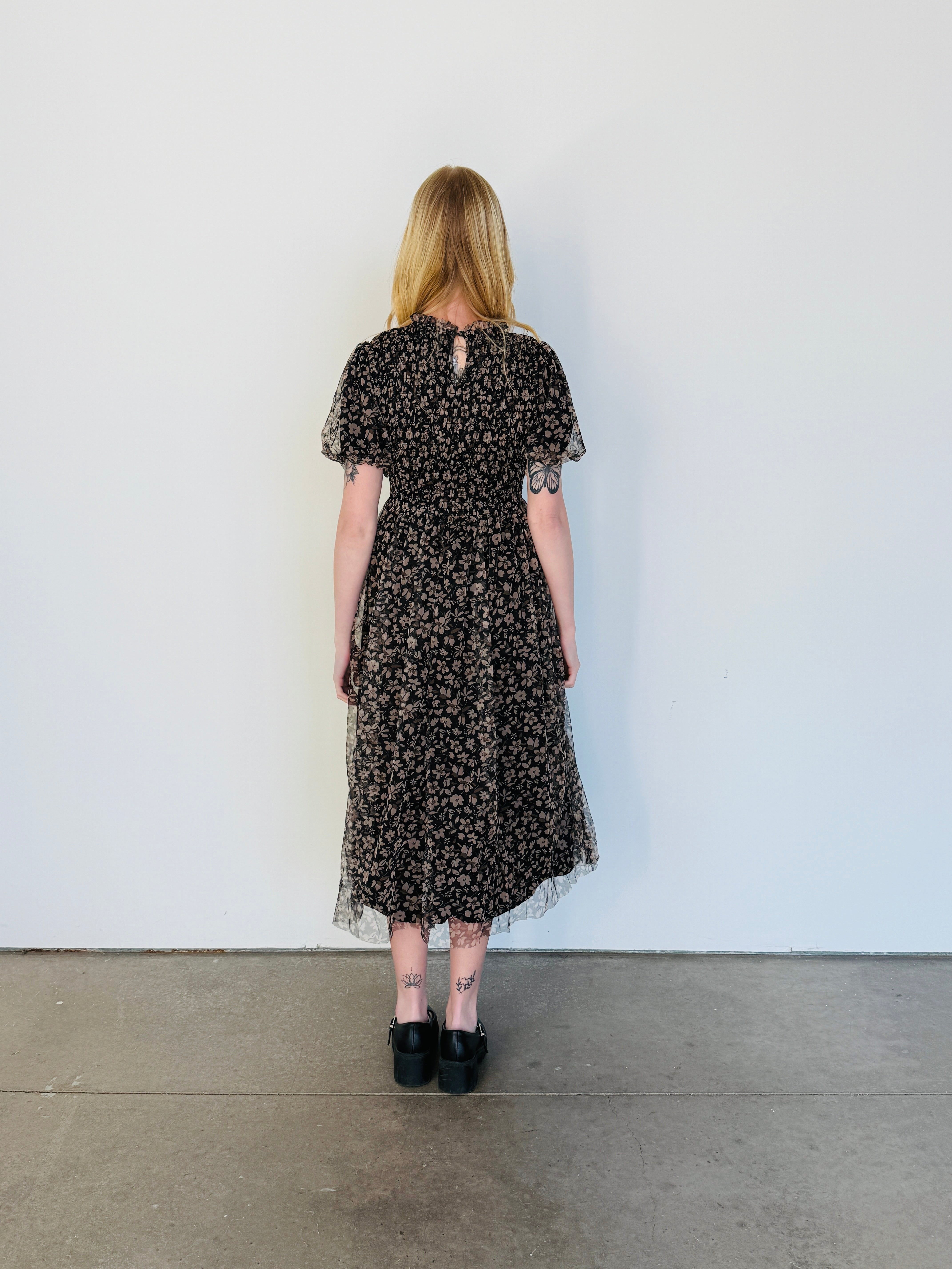 A smocked bodice promises a perfect fit with every wear of this elegant maxi dress patterned in a sweet garden of blooms.