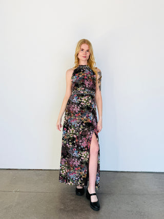 FLORA PRINT CHIFFON HALTER NECK MAXI DRESS