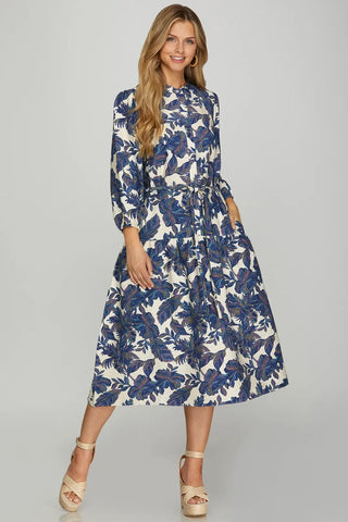 WOVEN PRINTED MIDI DRESS WITH WAIST TIE
