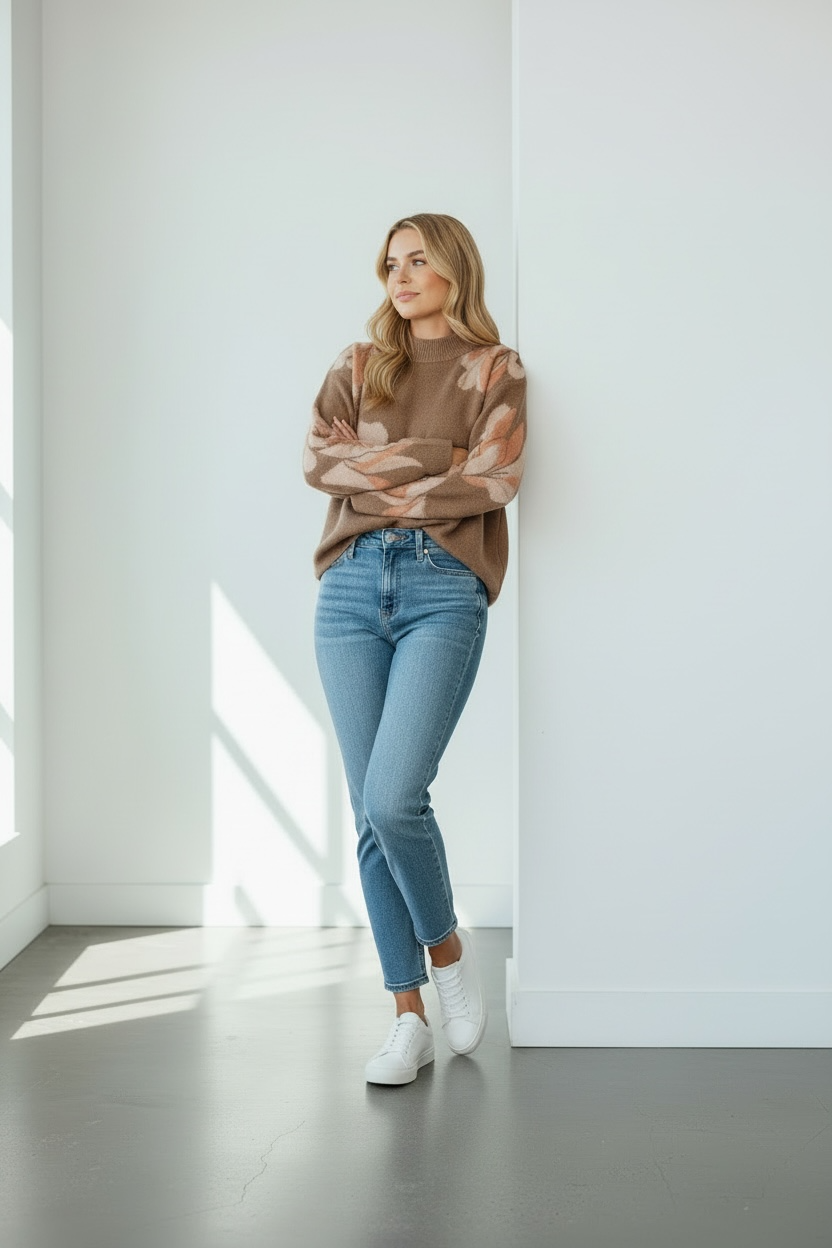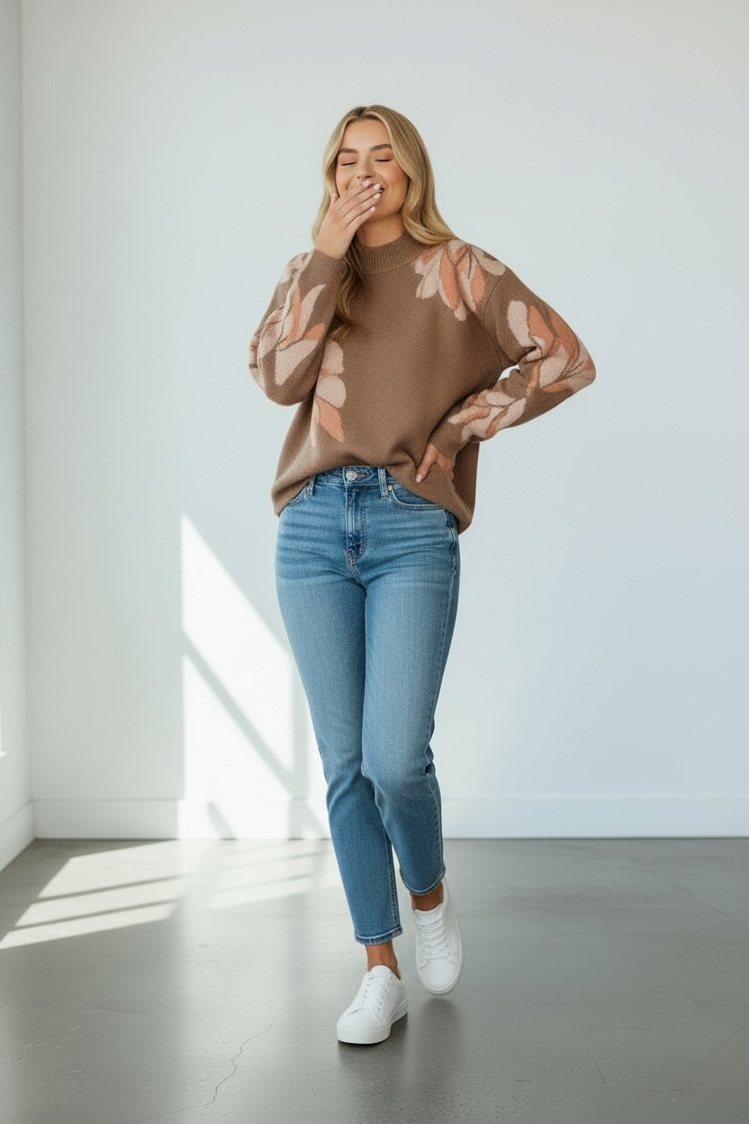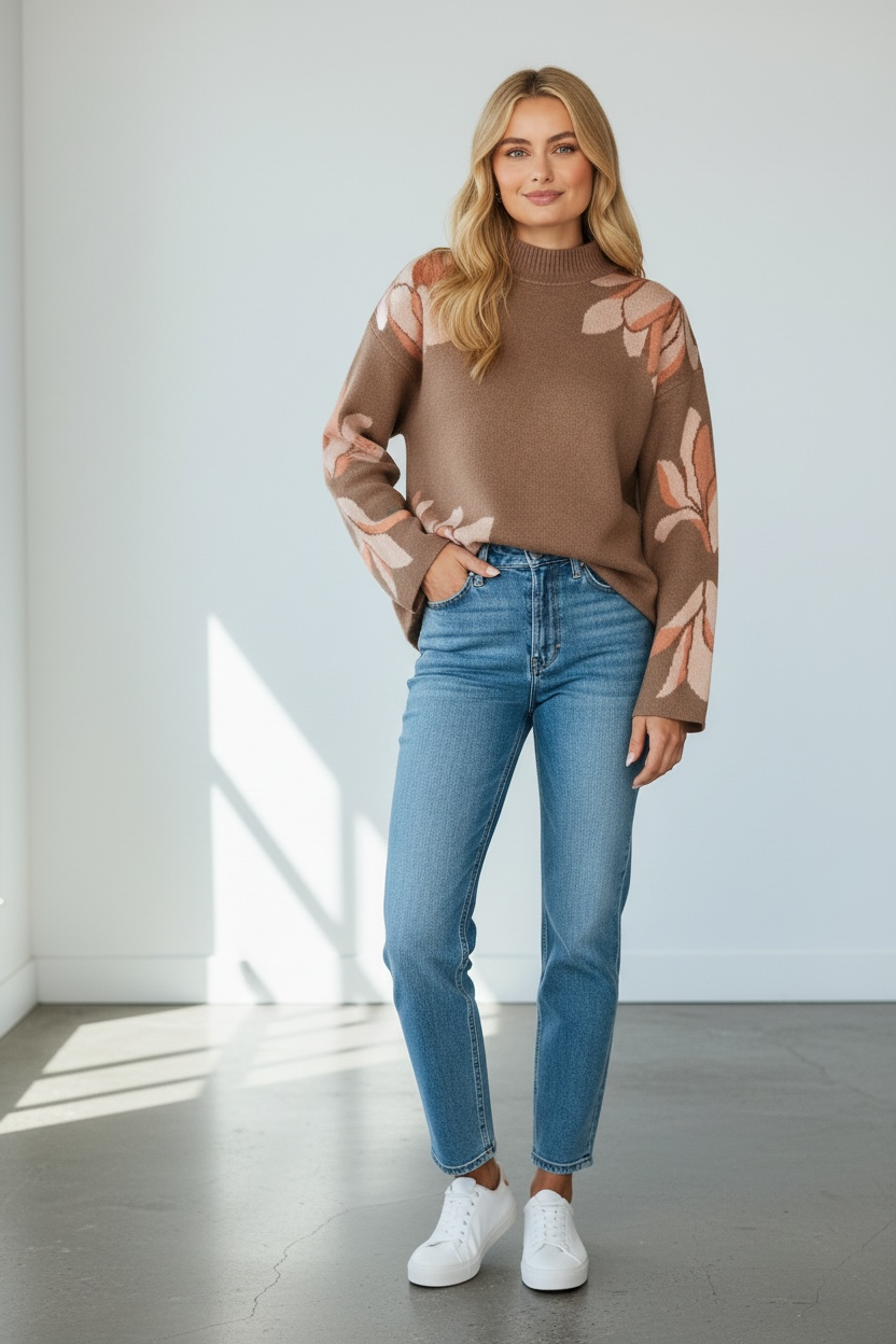 Soft, playful, and easy to wear, the Long Sleeve Mock Neck Flower Patterned Sweater adds a cheerful touch to your everyday knit rotation. Designed with a cozy mock neckline and an allover floral pattern, this sweater balances comfort with charm. The long sleeves and lightweight knit make it perfect for layering or wearing on its own through transitional seasons.