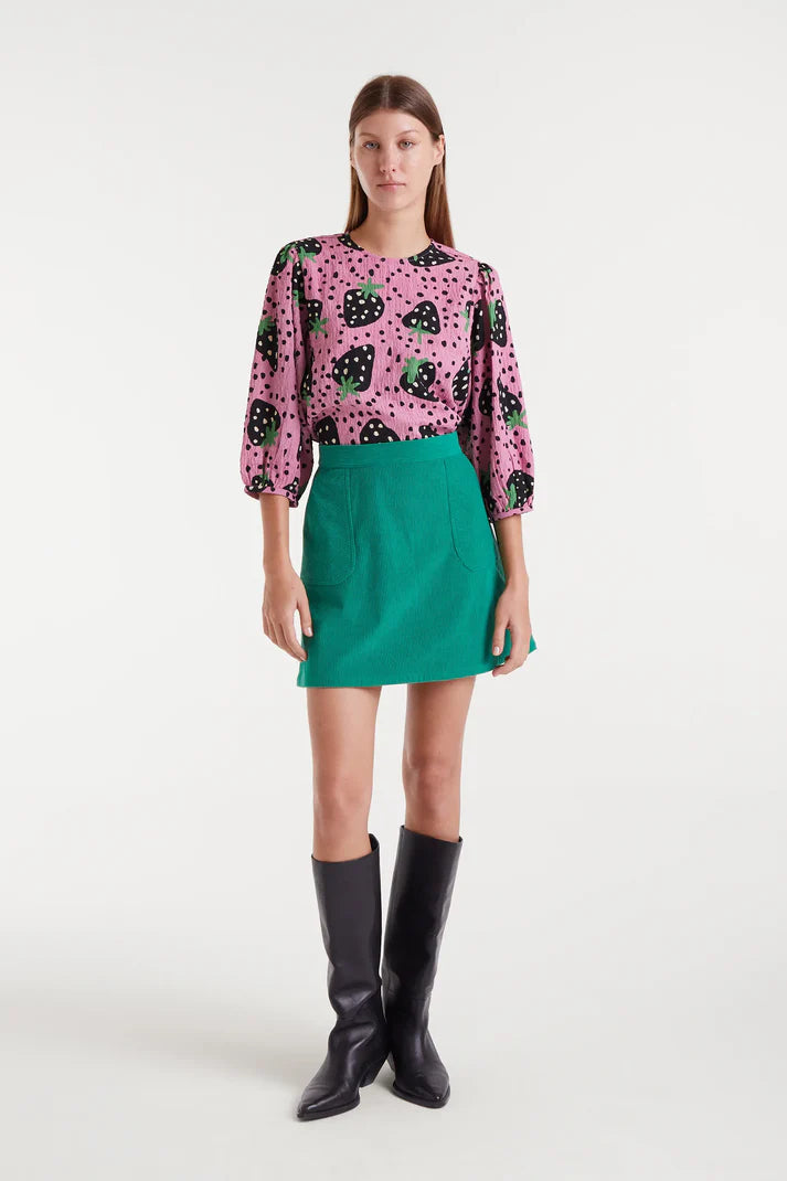 Sweet, playful, and easy to wear—this lightweight crinkled top features a bold strawberry graphic print that’s perfect for brightening up any outfit. Designed with a round neckline, three-quarter sleeves, and a delicate button closure at the back, it’s a fresh twist on everyday style.