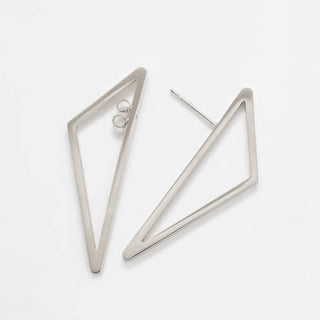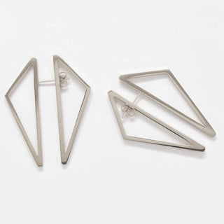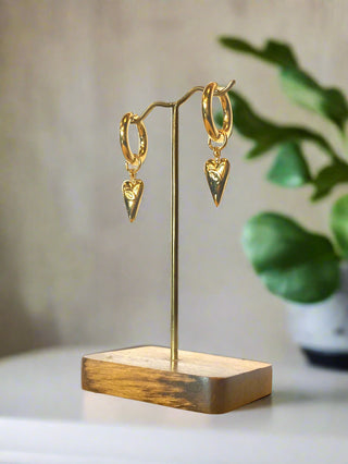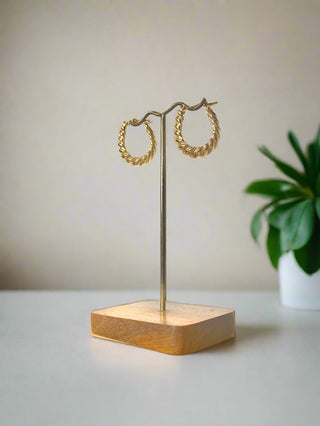 A pair of SQUARE HOOP WATERPROOF EARRINGS from Shop-Peppermint, featuring a geometric gold-plated design with diamond shapes, are showcased on a wooden stand. A softly blurred background with greenery and fabric enhances the scenes lighting, highlighting the earrings metallic sheen.