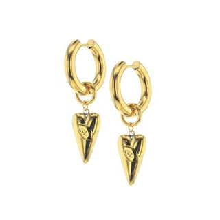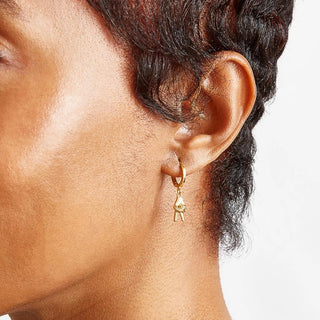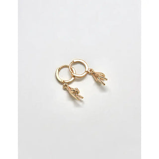 Shop-Peppermints PEACE OUT HUGGIES are gold-plated, nickel-free hoop earrings with hand-shaped charms. Set against a white background, these elegant and simple earrings highlight thoughtful design.