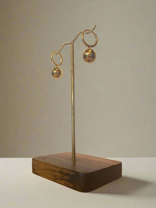 The GOLD ORBS WATERPROOF HOOPS by Shop-Peppermint are elegantly displayed on a minimalist wire stand with a wooden base, set against a soft beige background. The gold-plated hoops with round pendants promise durability with their stainless steel construction.