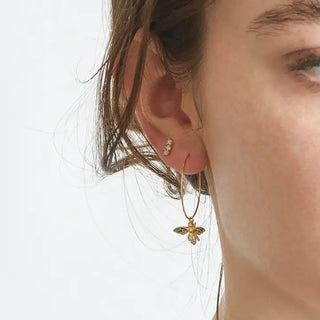 A close-up features someone wearing two Shop-Peppermint earrings: a small gold cuff with pearls on the upper ear and the BEE RADIANT HOOPS, a gold hoop with a multicolor pave bee charm. The neutral backdrop highlights these elegant, nickel-free accessories.