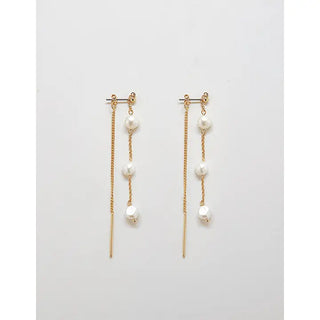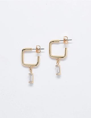 The GLEAM DROP HUGGIES by Shop-Peppermint are gold-plated square hoop earrings with post backs, each adorned with a dangling clear crystal. Their elegant design makes them perfect for any occasion and they are showcased on a plain white background.