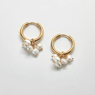 The GOLD ORBS WATERPROOF HOOPS by Shop-Peppermint are small gold-plated stainless steel hoop earrings with a dangling gold sphere, offering a shiny, reflective finish and smooth surface, set against a plain white background for an elegant accessory choice.