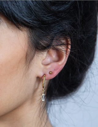 A close-up reveals a persons ear stylishly adorned with Shop-Peppermints GLEAM DROP HUGGIES: a small stud in the upper lobe and a chic hoop with a rectangular clear stone in the lower lobe, their dark hair pulled back elegantly showcases this refined earrings style.