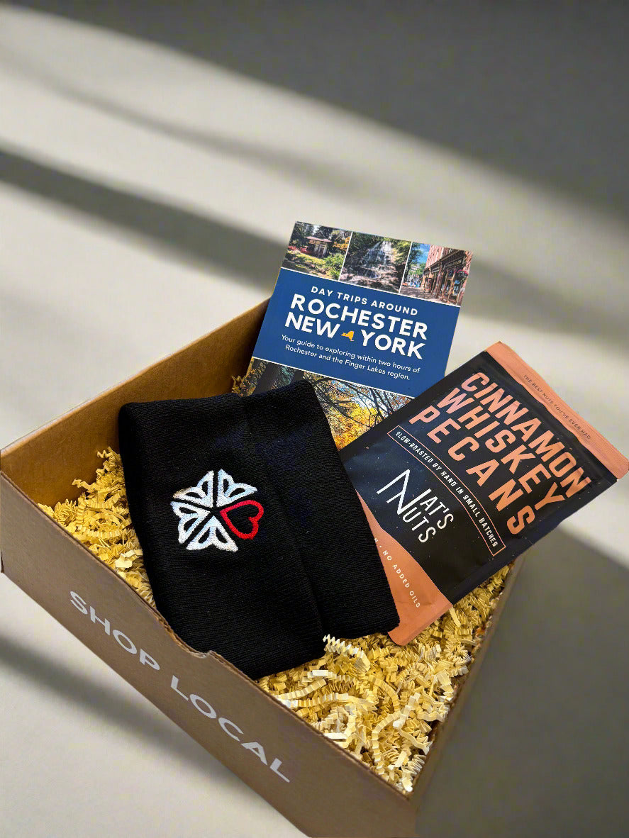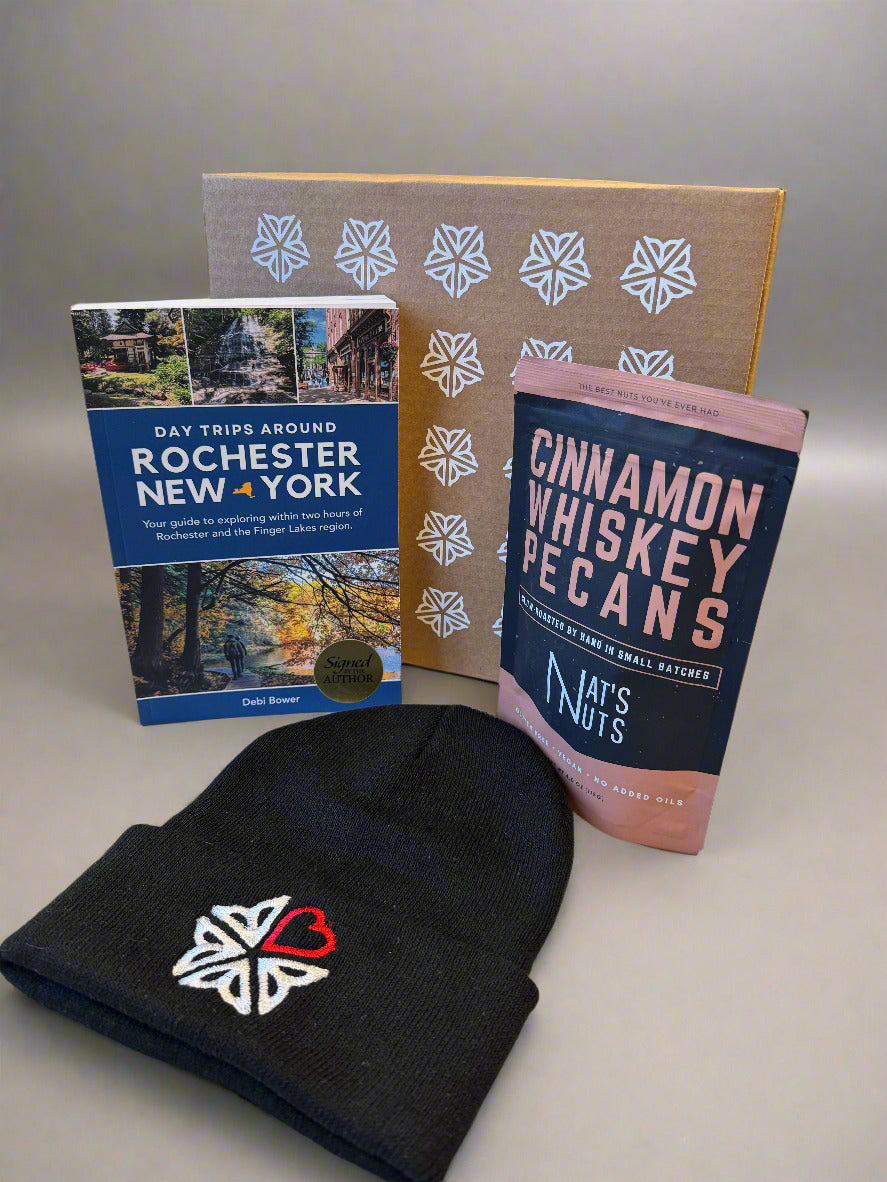 Discover the best of ROC with our SHOP SMALL GIFT BOX: EXPLORE ROC EDITION! Take day trips and support local businesses with our book, stay warm in style with the embroidered beanie, and enjoy delicious cinnamon whiskey pecans. Perfect for the adventurous and mindful shopper.