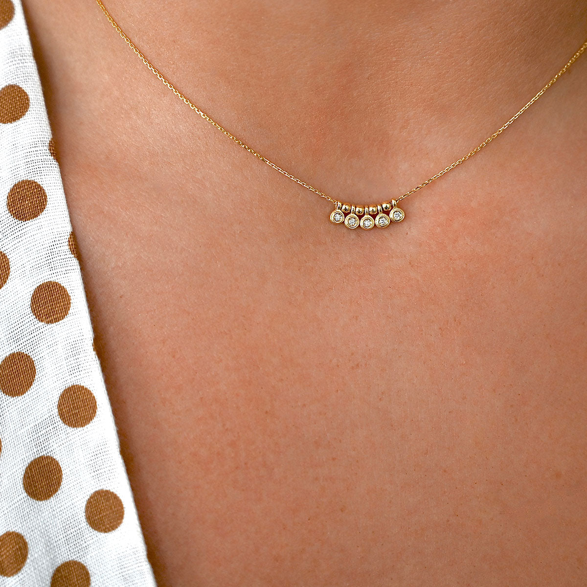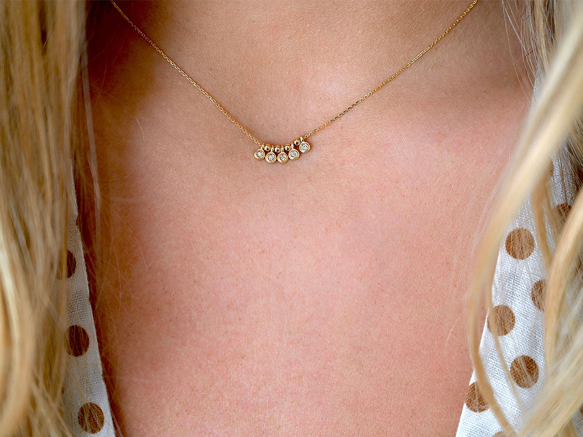 Five diamond charms delicately drape the nape of the neck, allowing for just the right amount of sparkle. Give this beautiful diamond necklace to yourself or a loved one.