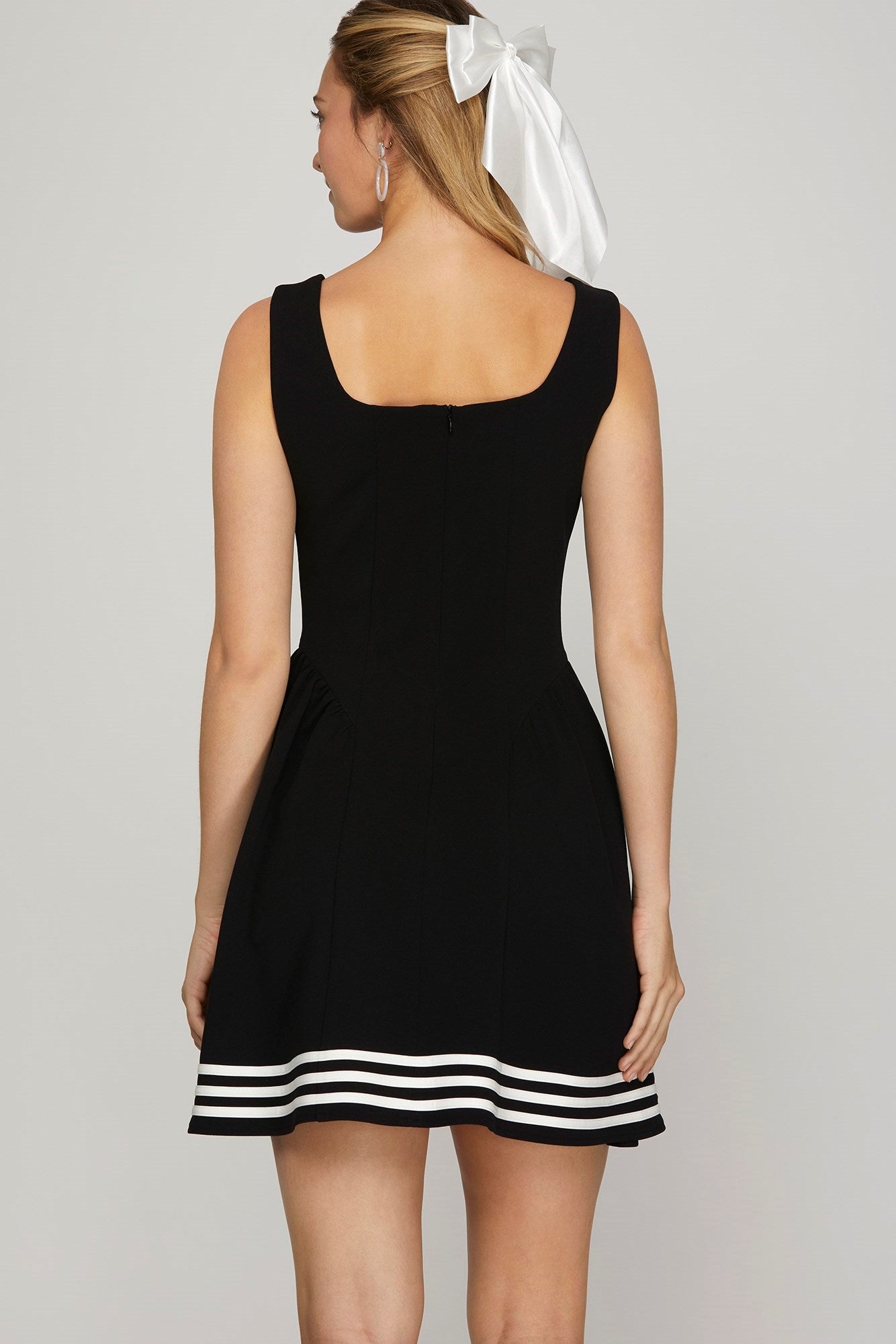 Minimal with a modern edge, the Sleeveless Square Neck Heavy Knit Mini Dress is all about sleek structure and bold contrast. Made from a substantial stretch knit, this fully lined mini hugs in all the right places while the crisp square neckline and color contrast trim keep the look clean, sharp, and sophisticated.