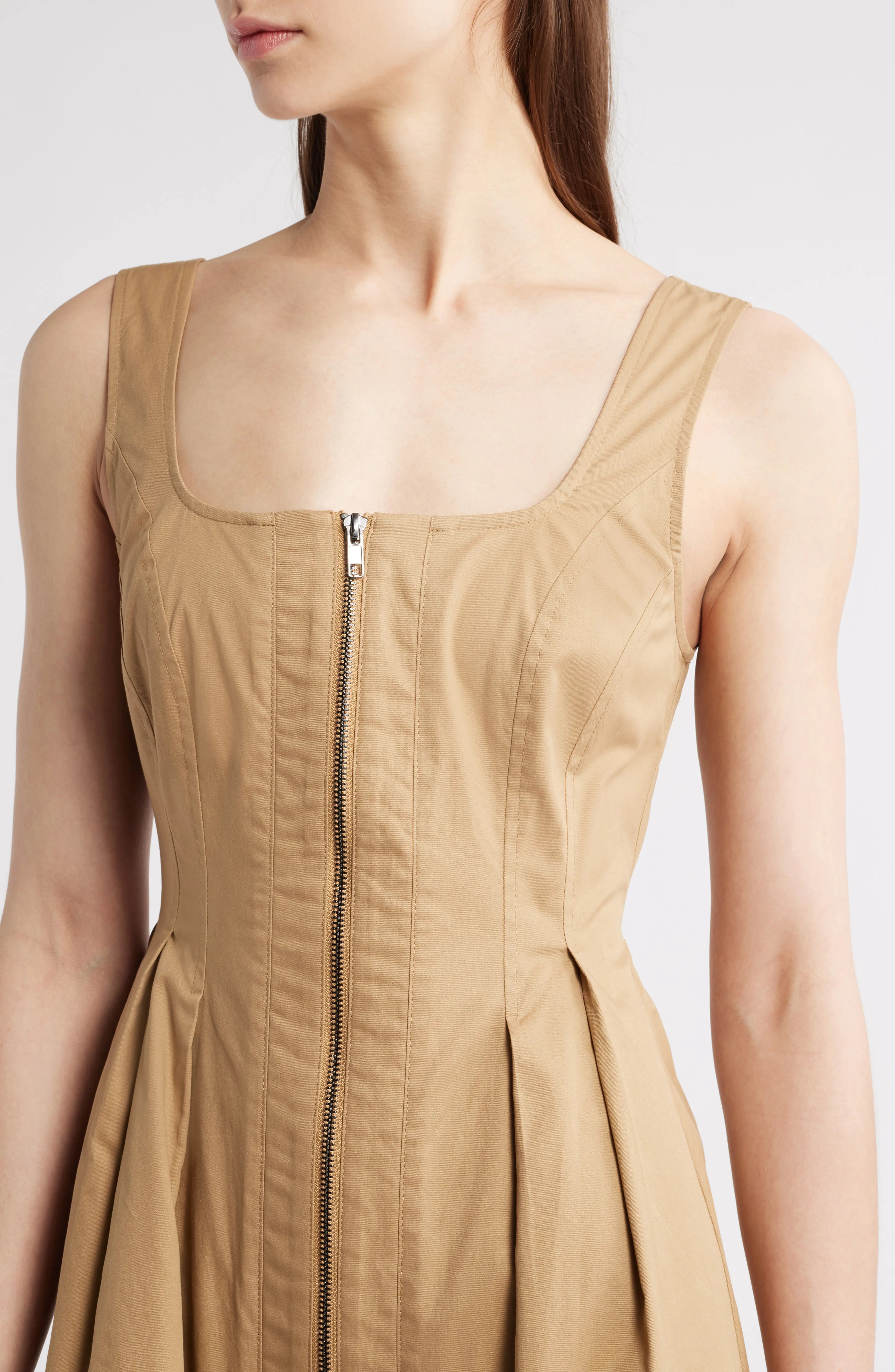 Strong pleats and a bold exposed zipper give this modern cotton midi dress a structured, city-chic vibe. Designed with a square neckline and a comfortable smocked back panel, this sleeveless silhouette balances sleek lines with breathable ease. Whether dressed up with heels or kept casual with sneakers, this dress is your versatile warm-weather staple.